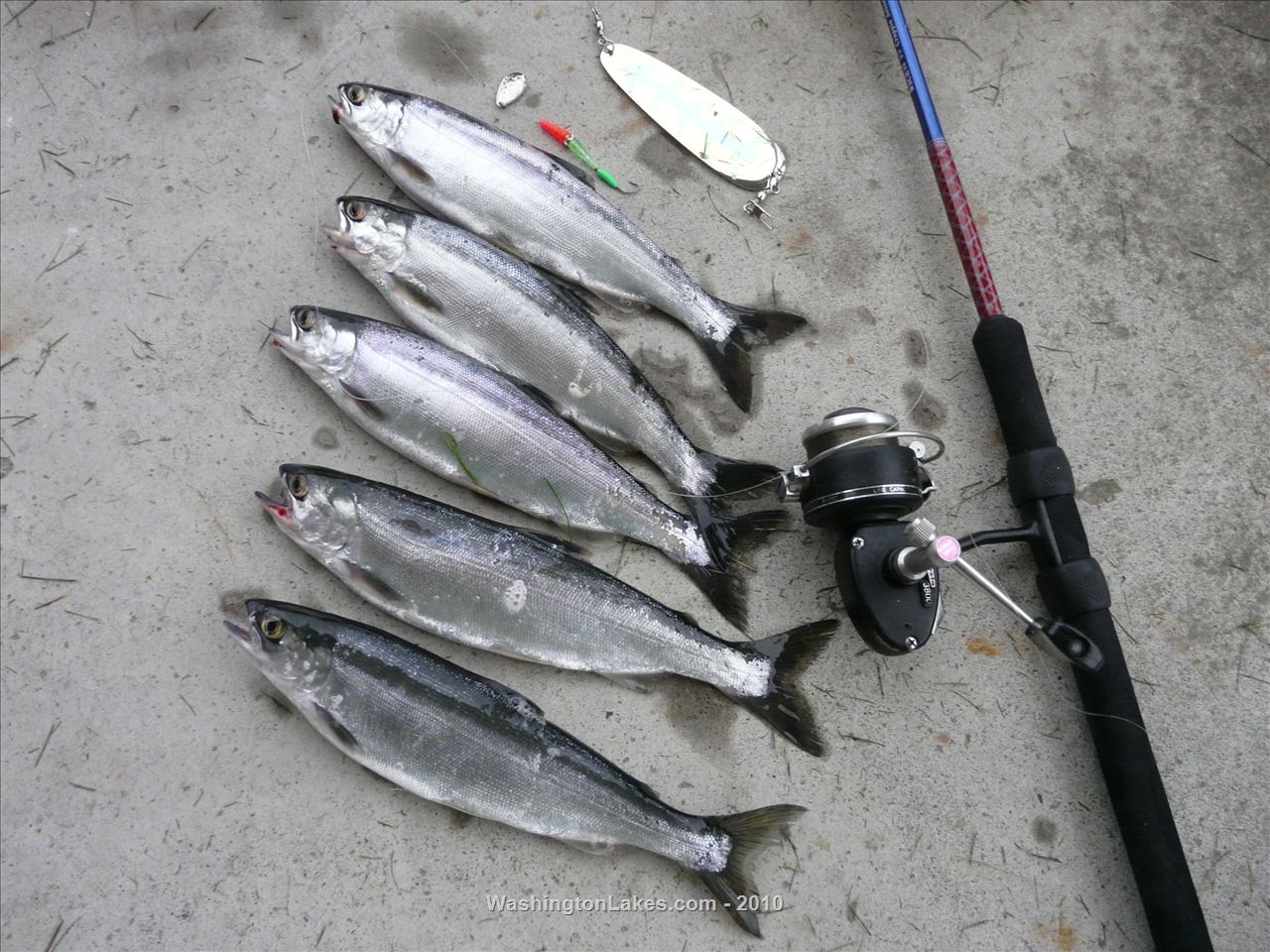 Sunday evening and the rain had let up, so I threw my little 9 foot fish slayer in the back of the truck and off to lake Samish. Hit the water about 5:30 and start long-lining a sling blade and orange/green wedding ring with a 3/4 oz. weight to get it down 5 - 10 feet. First fish in the boat less than 100 feet from the boat ramp. Steady bites for the next hour and 5th fish in the boat by 6:45. A great, though brief evening on the lake.