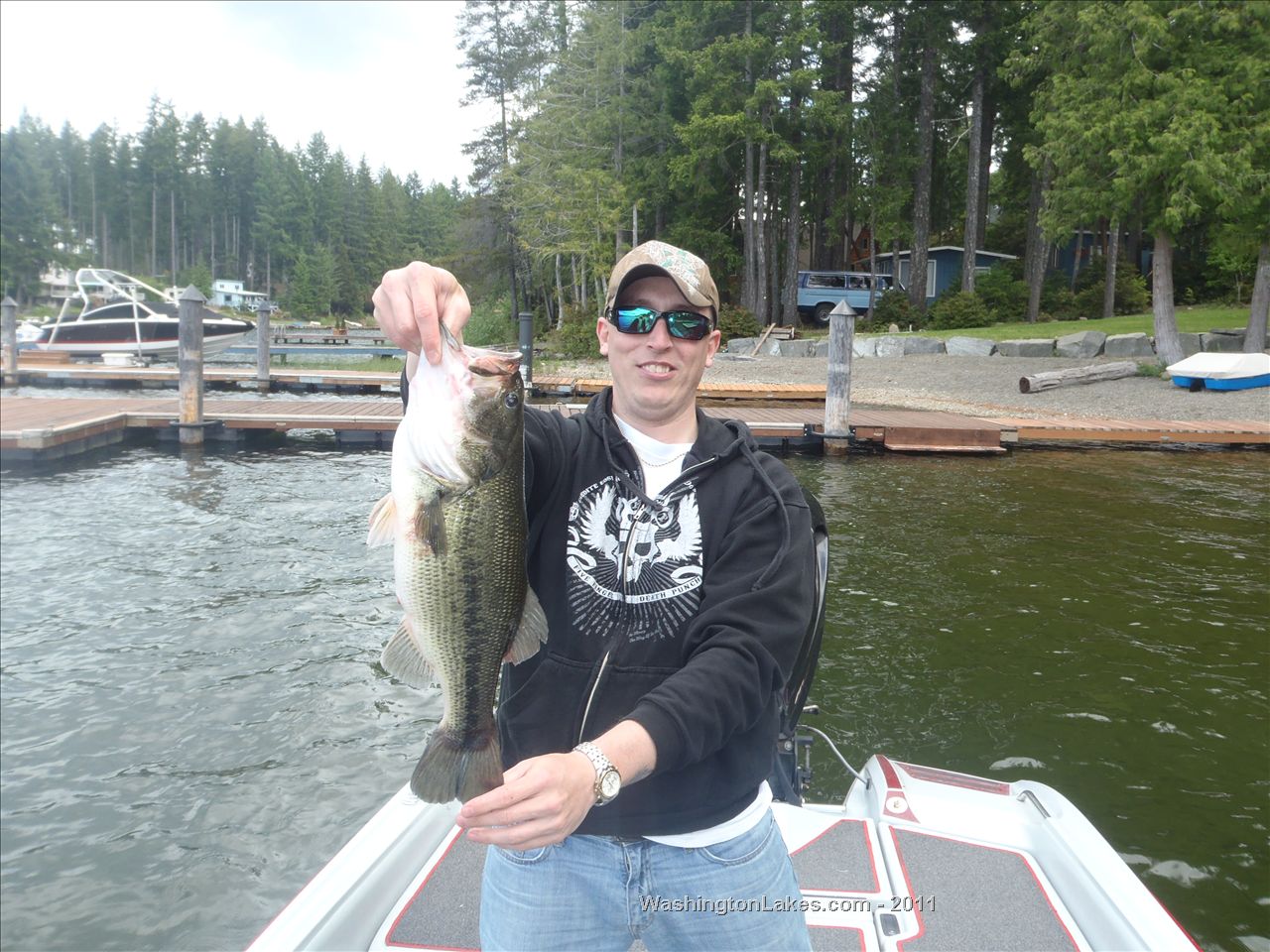 Hit Mason Lake today for the first time in awhile. Cruised around several spots throwin' jigs, brush hogs, cranks, and even a swimbait (I think I got a bite on the swimmer?). Saw about 6 bass in several spots, a few under docks that we spooked and a couple pigs out cruisin in the barren flats. Fishing just out from the finger by the launch and my backseater tossed his brown red flecked jig out to a weedline in about 10 feet of water and FISH ON! His first LMB of 2011 and a pig at that, 4 lbs 11oz. Nothin for me but you couldn't beat the smile on his face and the excitement on the boat from there on out. Mason still looks pretty dead vegetation wise and there was a lot of algae everywhere. Tight Lines all!