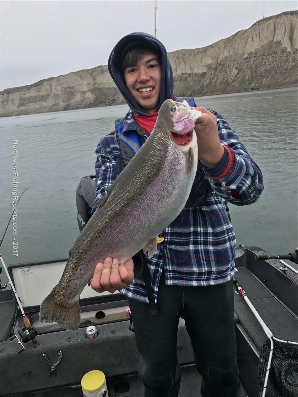 With one more pass through that same area, we picked up another 4 lb trout and released a few smaller ones. When we arrived at the net pens, we saw lots of walleye angers jigging in hopes of some gold, but we didn’t see too many hookups. We ran one pass through the center of the lake and caught a few smaller fish, then headed back to restart the troll. Keith switched the perch Rapala for a brown/gold one and within 5 minutes, I notice a tick on that rod, so I wait a second and it loads up, interesting bite, but fish on! I passed the pole to dad, who was taking a lunch break, and I get the net ready. My dad is not a fisherman. We have a pact together that goes as follows: I catch, clean, and cook the fish, and he eats them. (can you imagine a better deal!). while he is reeling in this fish, he says “it just feels like I am reeling in deadweight. I look about 35 feet behind the boat and say, “that’s a walleye, and a darn good one!” upon hearing this news, Keith jumped up and says “no way”, then he saw the color. WE STRUCK RUFUS WOODS GOLD”. My dad brings in a walleye pushing 20” and we throw the beauty in the box. Keith was shocked we caught a walleye pulling plugs in heavy current, with a water temp of 36. It was super awesome to see Keith so excited… by far one of the best highlights of the trip. We put the line back out and 30 second later, WHAM!!!! An absolute monster hits. I grab the rod, and the fish screams 40 feet of line off the spool. THIS WAS IT! THIS WAS THE FISH!  After a fantastic run, I try to gain line back, and I simply can't. I tried to pump the rod, but every time I lifted the rod after I had reeled down, I lost all the line I gained, and I couldn’t tighten the drag because we were using 8lb test! 5 minutes into the fight, my dad says “how long is this fight going to be?”. By that point I had 80 feet of line out on the counter. Finally, the fish tired out and worked him into the net. IT WAS A PIG. He tipped the scales at 8.53 pounds. MISSION ACOMPLISHED. That was my biggest trout ever. What a fish.