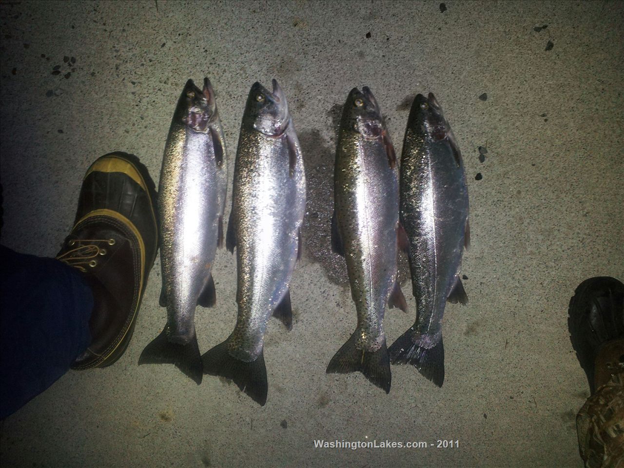 Went fishing today with "The Islander", launched at Lincoln around 0830 and motored down to Hawk Creek and set up trolling rippin minnows and flys. Fished them on sidewinders and longlined behind the boat. Caught a total of 5 fish, all 2-3 lbs. 4 caught on the rippin minnows. Was nice to catch some scrappy fish for a change. All fought real good and came out of the water several times. Water temp 42* and air temp was a cold 25* most of the day. We stopped for a bit and tried to catch walleye or burbots with no success. Saw one boat speed into Hawk creek by the buoys and fished for 20 minutes or so and did not see them catch anything. Most of our fish were caught on the south shore from the launch to entrance of Hawk. There be some fish out there.....