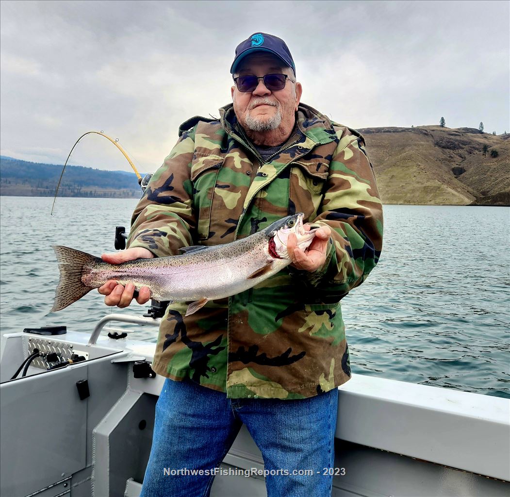 Finally was able to take ol' Jack out in hopes of him catching some of these beautiful rainbows. We ended up with 2 limits, having to release 4-5 with too many fins. All on all, several were 2-2.5 lbs., and one just under 3. He has heard of some of my previous trips, but maybe thought I was "telling fish stories"????. Now he believes me, and said he hadn't had that much fun fishing for as long as he could remeber????. All fish were caught trolling about 2.65 mph, with perch Kekeda flies on leaded line about 3 1/2 colors out. We didn't get a single bite with the downrigger set at various depths.
