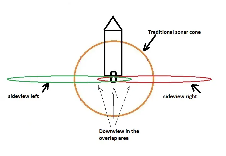 This first one is a top down view showing a circular 2D cone and the left and right SI cones. The left and right cones actually over lap in the center. The left SI element in the transducer actually sees a little ways to the right side of the boat and the right side element sees a little ways to the left side of the boat.