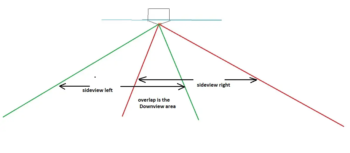 And I know the down scan is narrower than the 2-d because of experimenting with it a few years ago. Run over a rock, log, or brush, or dropoff that I know is there, and it shows up first on the 2-d because of the full round cone, then on the down scan. Then run to the side of that object, about 5 or 10 feet away, and it'll show up on the 2-d, but not on the down scan, but will on the side scan.