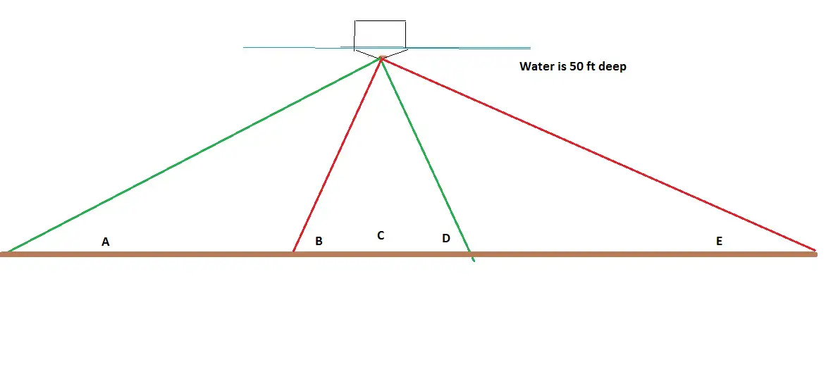In the first drawing, this is a view from the back looking forward. Lets say there are a series of targets sitting on the bottom - rocks, fish etc. From left to ring A,B,C, D, E.
