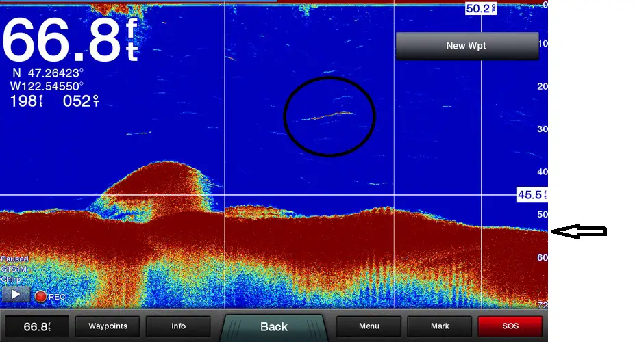 2A)If the fish is mirrored on both sides (and only then), then you can get an idea of how deep the fish are by how far to the side of the center line they are. So if you have a fish showing on both sides and its 20 ft from the center line, then that fish is 20 ft deep and under the boat. if the fish is NOT mirrored, then you have no clue about the depth or distance - unless its throwing a shadow. We will get into shadows shortly.