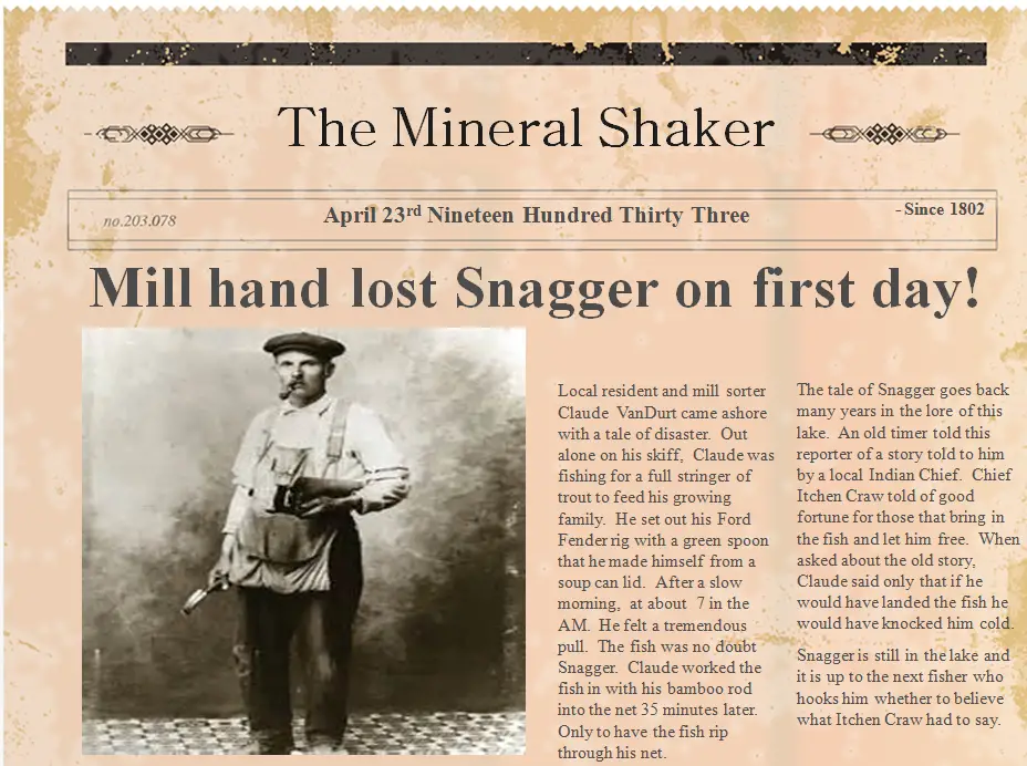 I found this on the internet. Seems the story of the big fish in Mineral Lake goes waaaaay back...