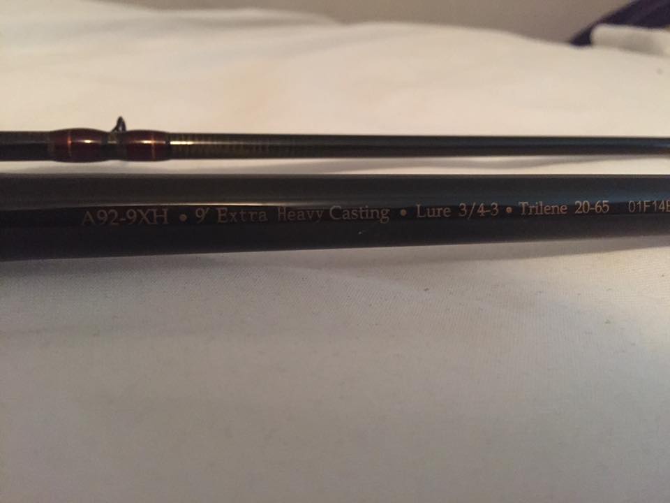 Lamiglas 9'4" 8-17lb xmg50 casting. A very small section of the tip was broken but I had it repaired so now it's around 9'3". Overall in good condition $140.