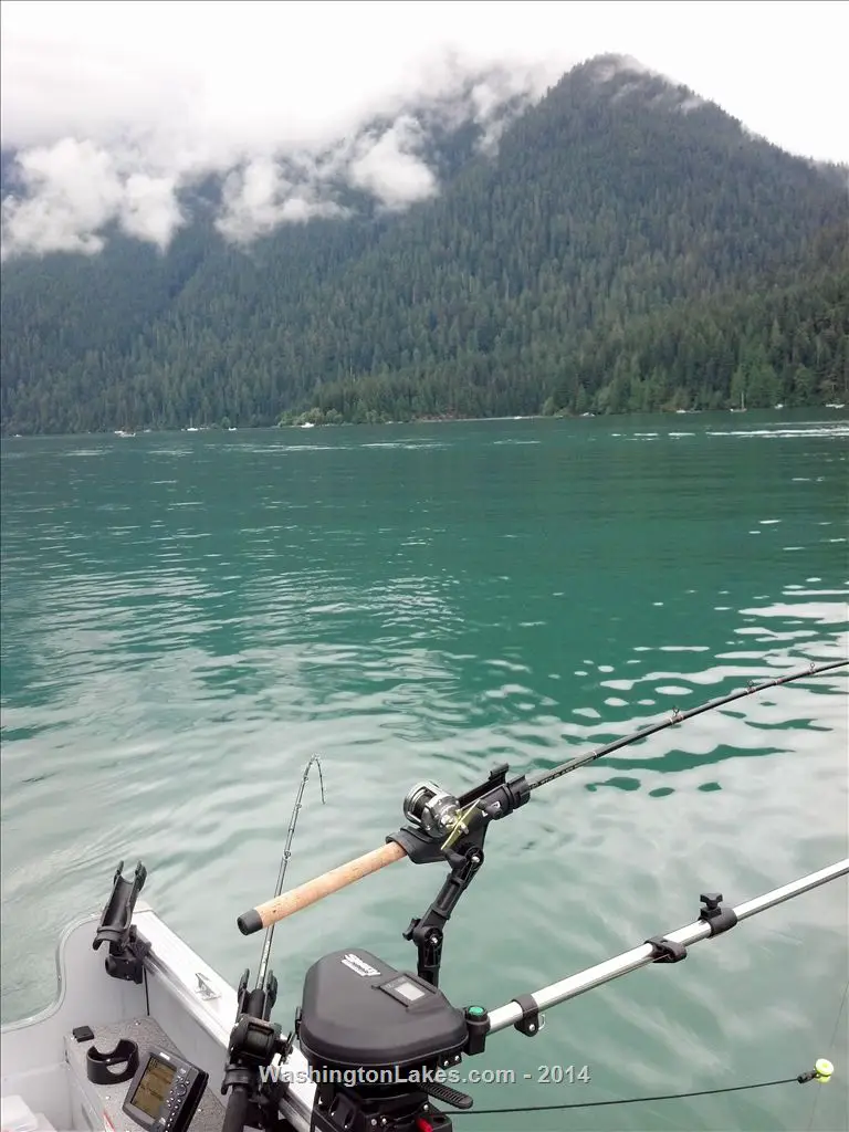 I decided to work my way towards the Shannon Creek side of the lake and as I started working the north side of the lake the rigger released popped and it was fish on. In that it was daylight I woke up the sleeping bag and handed her the rod. While still holding the sleeping bag around her waist with her elbows she expertly guided the boat’s first Baker Lake sockeye of the year into the waiting net and then went back to sleep. From that point we were on our game and had consistent action catching some fish, losing some fish and releasing the kokanee, dollies and a small coho until we pulled the plug and headed back to the ramp.