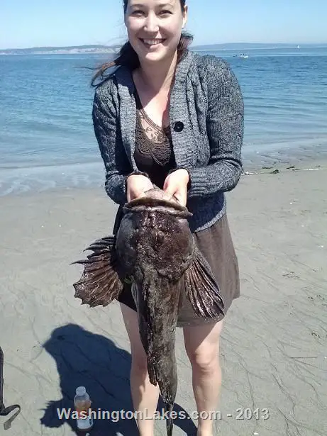 Took a little trip up to point no point to see if the pinks were rolling through, got there at 11:30 and fished til 2:30. I started out with the wannafishalure Dash point special on the north side of the light house. A couple people mentioned that the pinks were schooling at about 9:30 that morning. My husband Danny starts with a 1 1/2" buzzbomb with half a bubblegum steelhead worm on the hook. He hooks a pink on his second cast and loses it just before the beach. I am not having much luck, my ol twitching method hasnt won me a bite. But his fish hit way out from the beach which is much different than browns point. I am about ready to switch it up when I hook into something heavy. At first I thought it was a fish cause I swore I felt head shakes. Then it just feels like I am pulling in a big ol rock or log. I get it to where I can see the things shadow and the rock takes off. So I guess it actually is a fish! I get it back close and it looks like a big ling. Some more tug of war and I get the fish to the beach, its a BIG old cabezon! Caught by twitching a jig! This big guy measured at 31inches. Biggest cabezon to date for me and a weird to catch twitching a jig from point no point. I wish I had weighed him. The harbour porpoises were fishing close to shore so we moved to the other side of the point with the tide coming in. Danny casts into the rips and hooks into another pink. We decide to call it a day since we didnt bring a cooler and didnt want the fish to get ruined. Weather was beautiful with very little wind, we didnt see any schooling pinks, also we were the only ones to hook fish while we were there.