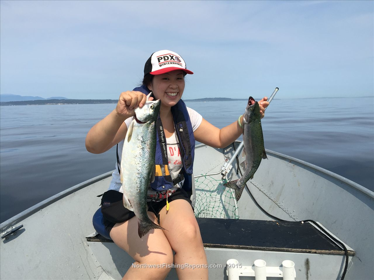 So we dropped in the "Humpy Kit" White flasher/Pink hootchie... A little while later her rod goes off. She caught her first salmon. Then we had a double. I'm holding pressure on mine, and netted hers with the other hand. Then she nets mine. The Pinks died down a bit after that, but we were kind of watching porpoises, birds, etc.
