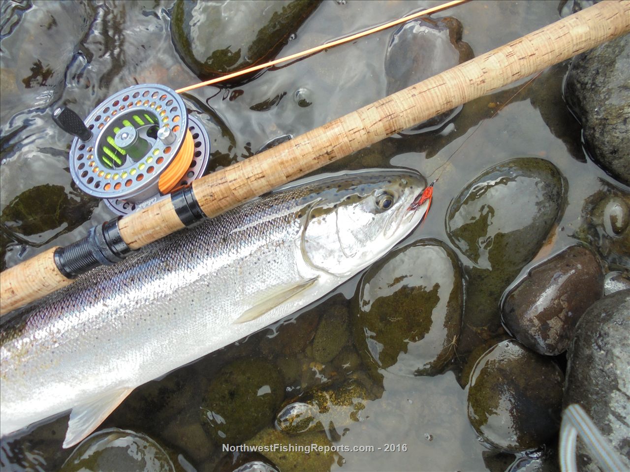Another afternoon of Spey rod fishing using the ultra sophisticated spey loops C, D and L - (chuck/duck/ & luck) to cast and hook some fish.  2 cooperated by swimming up onto the shore for me.  One georgous cart-wheeling hen broke up with me mid-stream,,,,, something about my being too controlling and not responding to her needs.