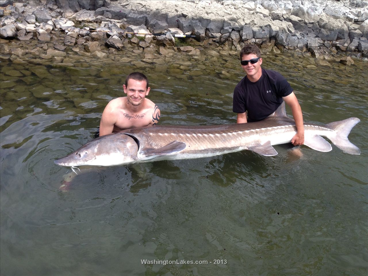 Took the trip from CDA, ID to Mcnary Dam for the weekend with the intention of landing a oversized Sturgeon and we did just that. I found some shad floating down the river a few weeks ago after work, most likely casualties of the dam or spawned out fish? We tried close to the dam for about 45min with no luck then hooked up in the deep hole, WA side, above the bridge. That being said, fishing was Excellent up until our anchor was stolen 2 hours into our 2 day fishing trip!!
