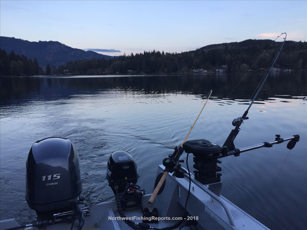 First night out on Samish this year directly targeting Kokanee (fished 2 weeks ago for bass). One or two strikes, but nothing in the boat unfortunately. We fished 3 rods with a variety of colored dodgers and hoochies or wedding ring spinners. Fished between 20' and 60'.