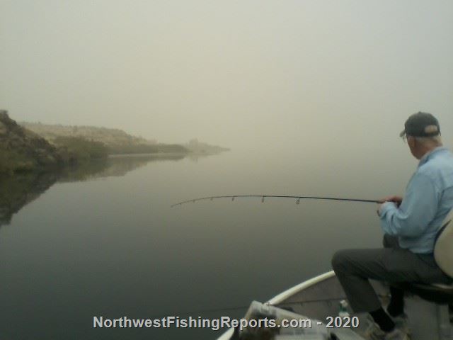 Wanted to label this report, "Smoking hot fishin", but changed it to "Fishin in a fire fog." Had planned this trip with my buddy, Slippery Jack" for a while as the moon phase, temperatures and wind forecast was excellent. Only thing that changed this forecast was the smoke from the fires. Smarter people would have cancelled due to smoke, but?? Spent all our time in the Crow Butte to McNary Dam area. This was the first day of a 5 day trip with plans to target smallies, channel cats, walleye, and sturgeon. We were able to play with smallies a lot and 1 sturgeon. Tried real hard for the walleye with no luck, (very frustrating), and no time for cats. We think the smoke haze dropped the water temps quite a bit, which put the fish into a non-playing mood.