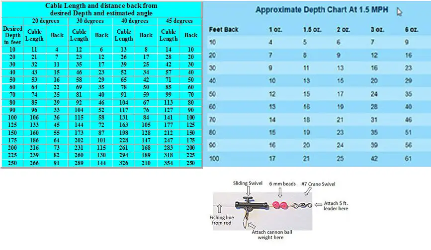 Here is a depth chart for trolling weights. You can also google trolling depth chart and look at images. Ive also seen guys use hollow core pencil lead with wire or cable in it so you have a low profile. So the weight doesn't affect your lure much. You will need to weigh it to get the weight you want. Hope this helps.