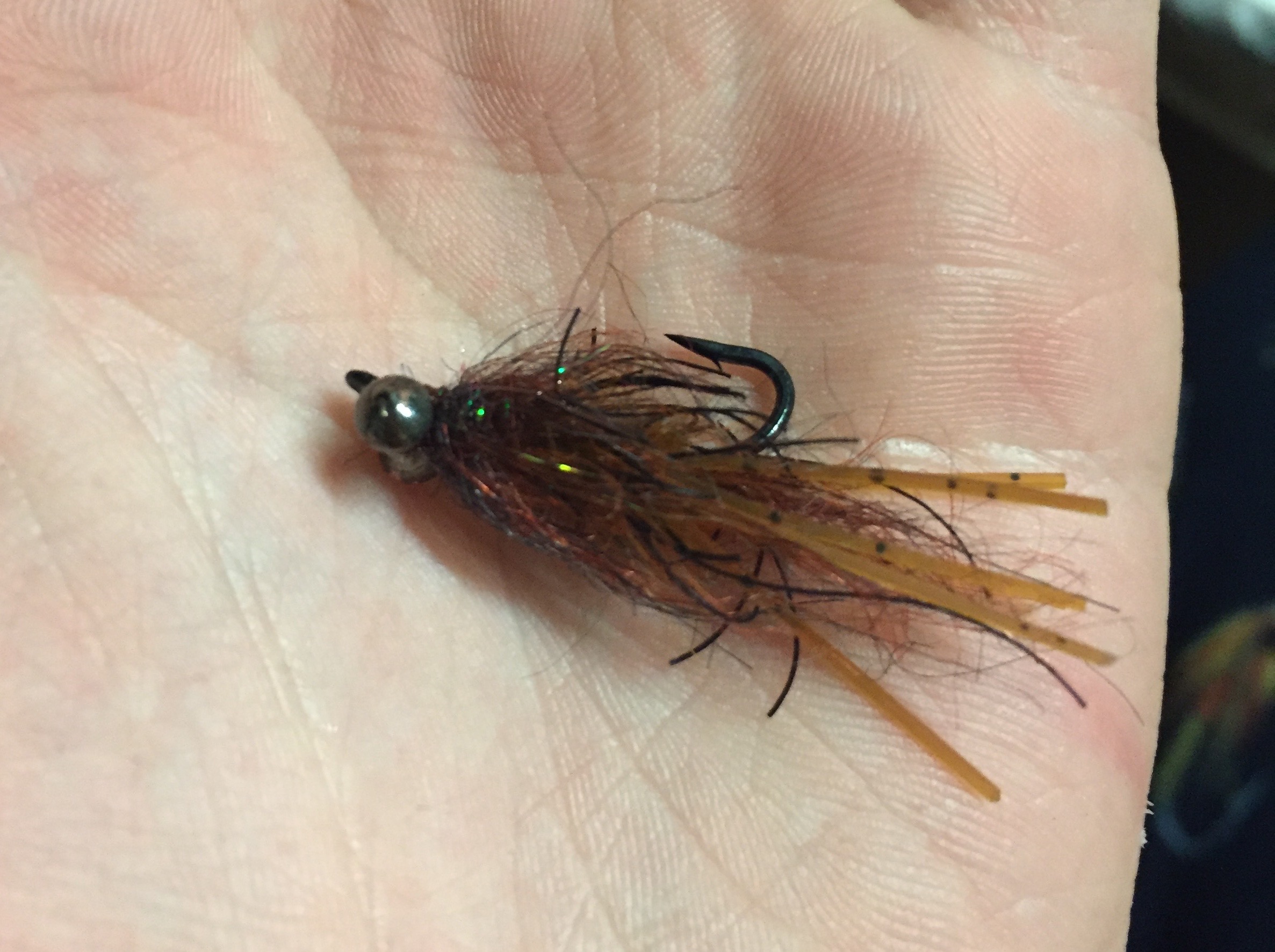 Yessir, a mixture of a semi-seal leech and crazy dad. Lead eyes lead to an up-riding, quick sinking pattern, burying in the top jaw of trout. Cuts through weeds like a champ too. Tied on a #6 salmon hook (more like a 2x long #8). Is it a leech? Is it a craw? Who knows. It's the woolly bugger of invertebrate patterns, representing a wide variety of species.