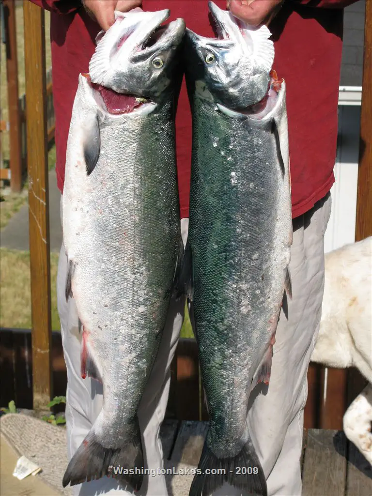 Went out to westport with my buddy crablegs in his 18ft olympic.We got there at 430am and were across the bar and fishing by 6am .We started fishing at 175ft and 20ft down.We saw lots of birds but not actively feeding but we put out our lines ,i had a white flasher with a white b2 squid.My buddy had a green flasher with a green a yellow squid .Our lures werent in 5 minutes and fish on .It went on all day long ,we trolled till 200ft due west trying for kings but only managed a small king that was released.The weather was great the water was great .The depths we fished were 20ft and later we went down to 50ft and over a hundred and caught silvers at all depths .There were only a few natives we caught most were hatchery silvers and in great shape.When we finaly kept our limit of fish ,we were cleaning the fish and a blue shark swam right behind the boat and ate the guts as we put them in ,he hung around a few minutes then swam off.I heard from the regulars that the kings were caught in the 30ft range pulling whole herring and whole sardines.The fish we caught had whole sardines in them ,these sardines were 7 or 8 inches big ones.The trip was a great one never so easy to catch quality fish .The launch wasnt busy coming or going .