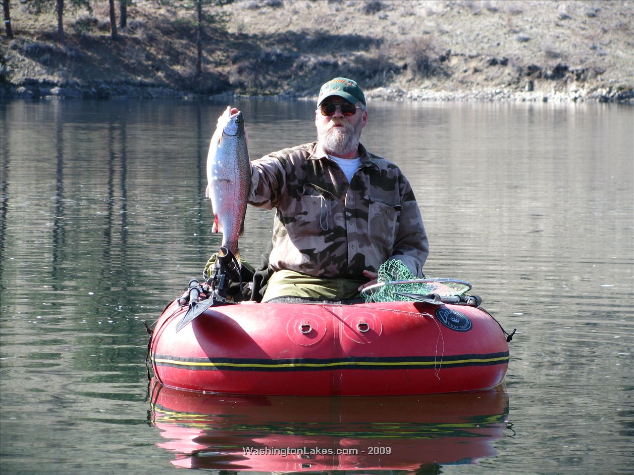 We fished Rufus Woods and Lake Roosevelt (read my report for Lake Roosevelt also) for four days from April 3rd to April 6th. Both bodies of water produced nice fish and the weather cooperated as well. We had some friends join us on our property on Lake Roosevelt from Montana and as usual we fished hard for four days from sun up till sun down. Each day we would split up with some going on the lake and some heading to Rufus, while some were on the pontoons, and some were on the boat. We never did get the boat on Rufus since the sinking fly line off the pontoons was working so well. Rufus won for size, obviously, but Roosevelt produced more fish.