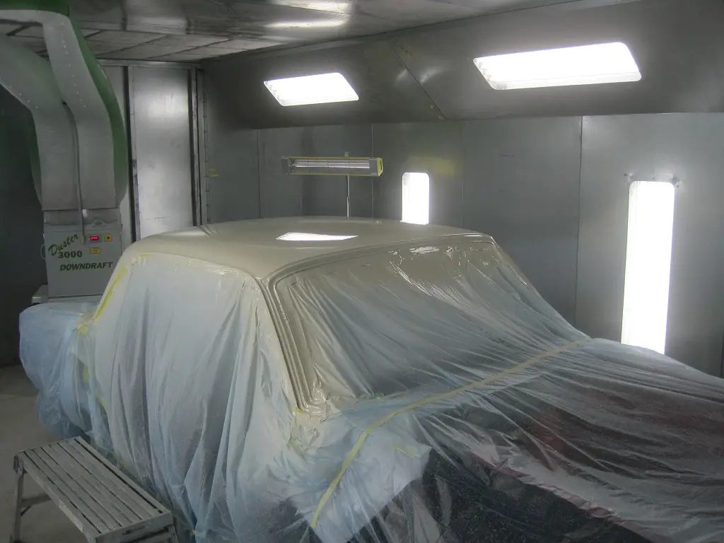 Got her in the makeshift booth for the paint. Skirt on, the interior went reasonably well: