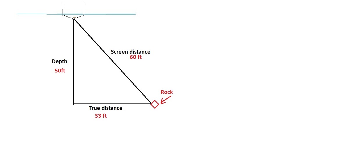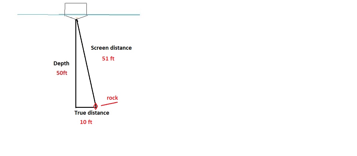 The math in that case works out to 10 ft. So that rock is really 10 ft over from the side of the boat when it looks like its 51 ft on the screen.