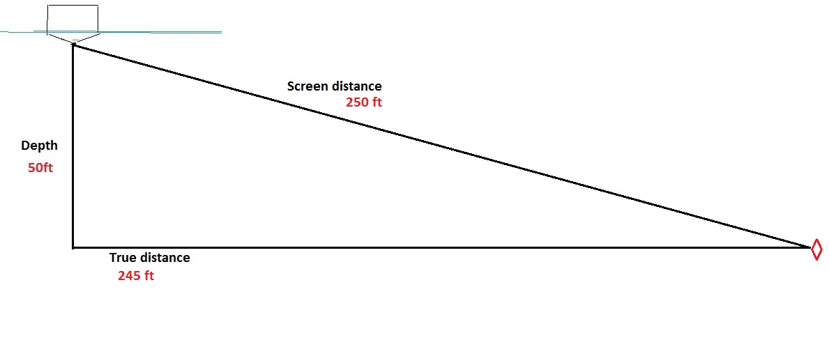 So, to sum up, the closer an object is to the center line, the more "off" its distance reading on the screen will be. The further away it is, the closer it will be. By the time you get to 2 to 3 times the water depth, its probably close enough.