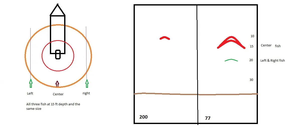 Remember my drawing from earlier about the size of arches based on where they are in the cone? Equal sized fish on the outer edges of the cone have shorter, weaker arches. Fish in the center have longer, stronger arches. The signal strength on the outer edges of the cone could be as low as 1/10 of the signal strength in the center and still give an arch on the screen.