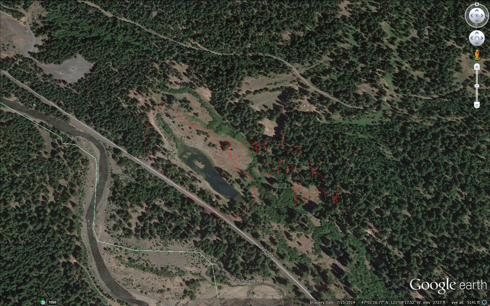 I did really well -- 5 trout on Kastmasters in 30 minutes. Quartz Creek Pond is on the Little Naches Road off of 410, and actually in Kittitas county (barely).